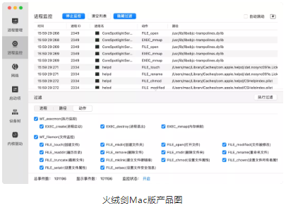火絨劍Mac版擁有進(jìn)程管理、進(jìn)程監(jiān)控、網(wǎng)絡(luò)、啟動(dòng)項(xiàng)、設(shè)備樹、內(nèi)核驅(qū)動(dòng)等軟件功能。該產(chǎn)品輕便靈巧,操作交互設(shè)計(jì)合理,擁有友好的界面、人性化的信息列表布局,方便用戶進(jìn)行線程級(jí)的程序分析與管控,可以提高用戶處理問題的效率。