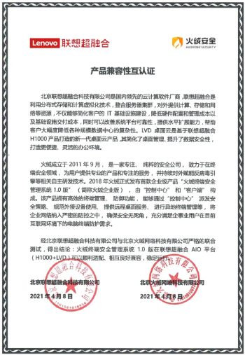 4月8日,火絨終端安全管理系統(tǒng)1.0版(以下簡(jiǎn)稱“火絨企業(yè)版1.0”)與聯(lián)想旗下產(chǎn)品(超融合AIO平臺(tái))完成兼容互認(rèn)證,“火絨企業(yè)版1.0”可與聯(lián)想該產(chǎn)品相互適配、穩(wěn)定運(yùn)行。