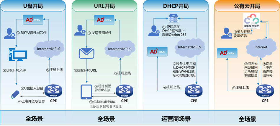 AD-WAN方案提供了多種自動化開局(ZTP零配置上線)能力,支持設備自動化上線后的統(tǒng)一配置下發(fā)和運維管理,前端無需專業(yè)的運維管理人員。釋放企業(yè)網(wǎng)管人員壓力,減少繁雜的開局和運維工作,降低人力成本。