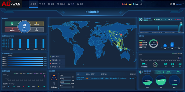 AD-WAN具備豐富的報表和大屏等工具,方便運維人員及時查看網(wǎng)絡狀態(tài)。比如網(wǎng)絡的可視化,支持GIS地圖集成;基于站點、鏈路等多種拓撲呈現(xiàn)方式,在網(wǎng)絡設備、鏈路故障時第一時間獲取告警或者異常信息;自定義的Dashboard,可以根據(jù)不同運維人員的偏好和關(guān)注點自定義設置。其次,可以直觀呈現(xiàn)應用的可視化狀態(tài),如TopN的應用流量展示、應用路徑展示以及健康度等,幫助運維人員實時掌握應用的運行質(zhì)量,輔助快速定位。