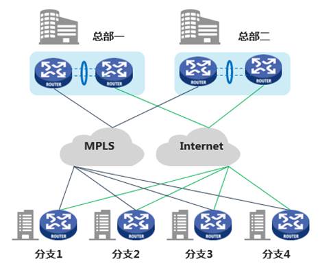 支持常見的Hub-Spoke兩級網(wǎng)絡和大型企業(yè)的三級架構(gòu)組網(wǎng),支持專線和互聯(lián)網(wǎng)鏈路混合接入,適用于分支數(shù)量多,位置分散的企業(yè)網(wǎng)絡。以縱向流量為主,通過ACL、DPI等實現(xiàn)企業(yè)關(guān)鍵業(yè)務區(qū)分和識別。